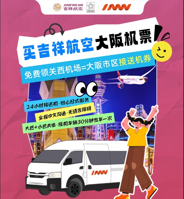 即日起購買吉祥航空前往日本大阪的旅客 可享受INNN空港“門到門”免費接送服務